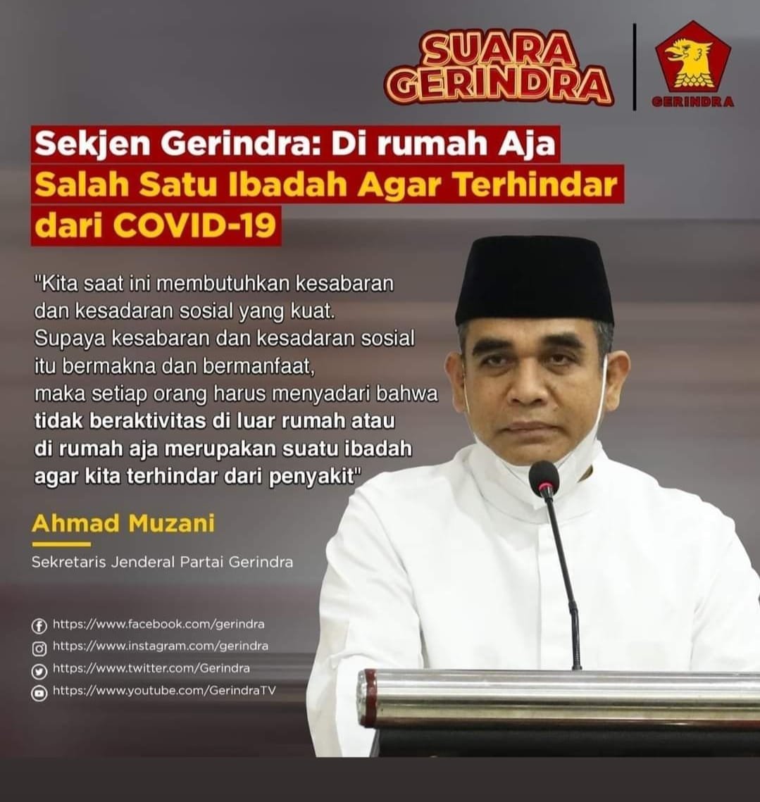 Menurut Muzani, dalam situasi pandemi covid yang terus meningkat ini dibutuhkan kesabaran dan kesadaran sosial yang tinggi. Setiap individu juga harus menyadari bahwa dengan berdiam diri di rumah (#DiRumahAja) juga merupakan suatu ibadah agar terhindar dari covid 19.
